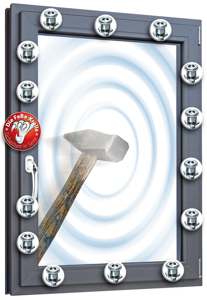 Schützen Sie sich und Ihre Familie mit diesem einzigartigen, einbruchhemmenden Sicherheitssystem für Ihre Fenster: Zwei wesentliche Elemente des Beschlags, der Pilzzapfen und der Schwenkriegel, werden fest miteinander verkrallt. Die FeBa-Kralle gehört exklusiv und ohne Aufpreis zur Standardausstattung unsere Kunststoff-Fenster von FeBa.